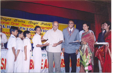 Shri. Prabhakar Kore, chancellor ,KLE University distributing free dental health kits to the Children at St. Paul’s School, Belgaum